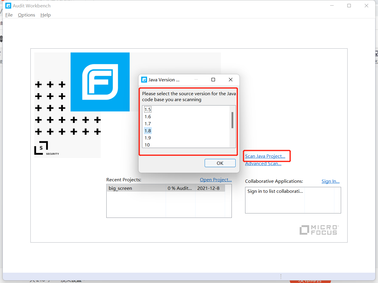 这里我选择的上面的扫描Java工程。导入项目代码(让开发提供源码),然后选择开发的Java版本