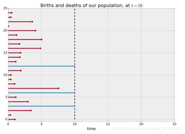 考虑这样一个例子:我们观测的目标人群实际上是来自两个不同的组(可以简单理解为患了不同的病),他们的平均存活时间是不一样的,假定A组的平均存活时间只有两个月,而B组的平均存活时间有十二个月。值得注意的是我们现在是把他们全部放在一起观测的,我们并不知道谁是A组谁是B组,而我们的目的是想知道这些人平均会活多久。 假定我们的实验进行了十个月就结束了。