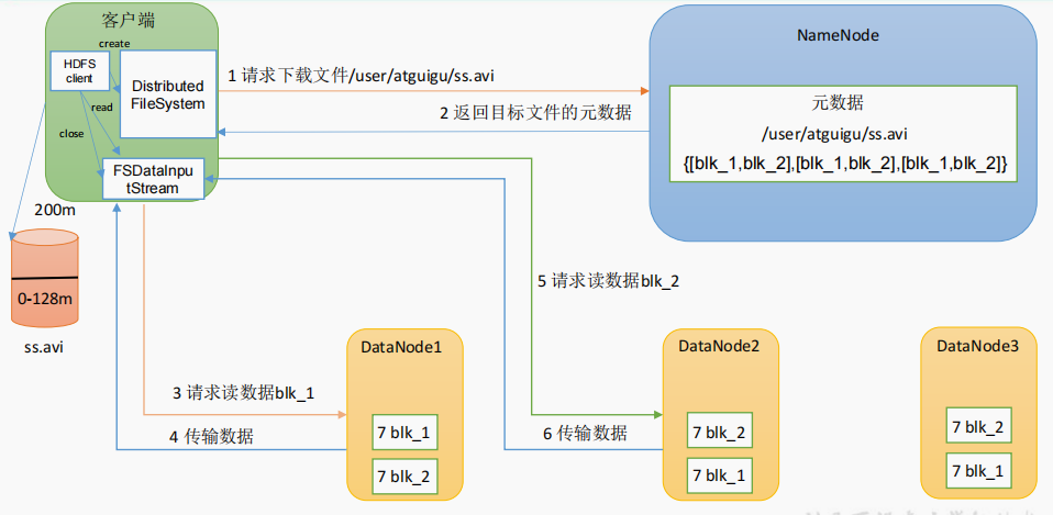 1)客户端通过 DistributedFileSystem 向 NameNode 请求下载文件,NameNode 通过查询元数据,找到文件块所在的 DataNode 地址