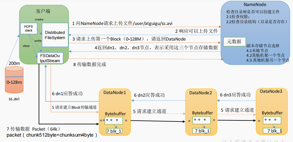 (1)客户端通过 Distributed FileSystem 模块向 NameNode 请求上传文件,NameNode 检查目标文件是否已存在,父目录是否存在