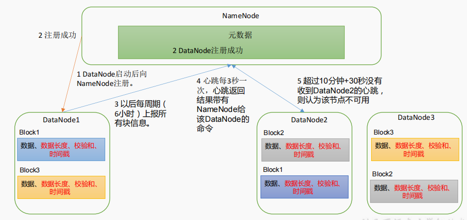 (2)DataNode 启动后向 NameNode 注册,通过后,周期性(6 小时)的向 NameNode 上报所有的块信息(时间可以配置)。