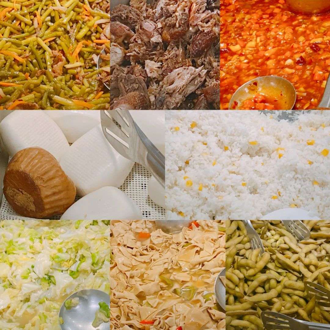 关于当天的餐饮选择, 肉菜有辣子鸡,茄盒,辣椒炒肉和咖喱虾,素菜有菠菜炒鸡蛋和醋溜白菜,主食有虾饺、米饭、奶黄包、芋头和玉米 。 由于是自助餐,没吃饱还可以再加。