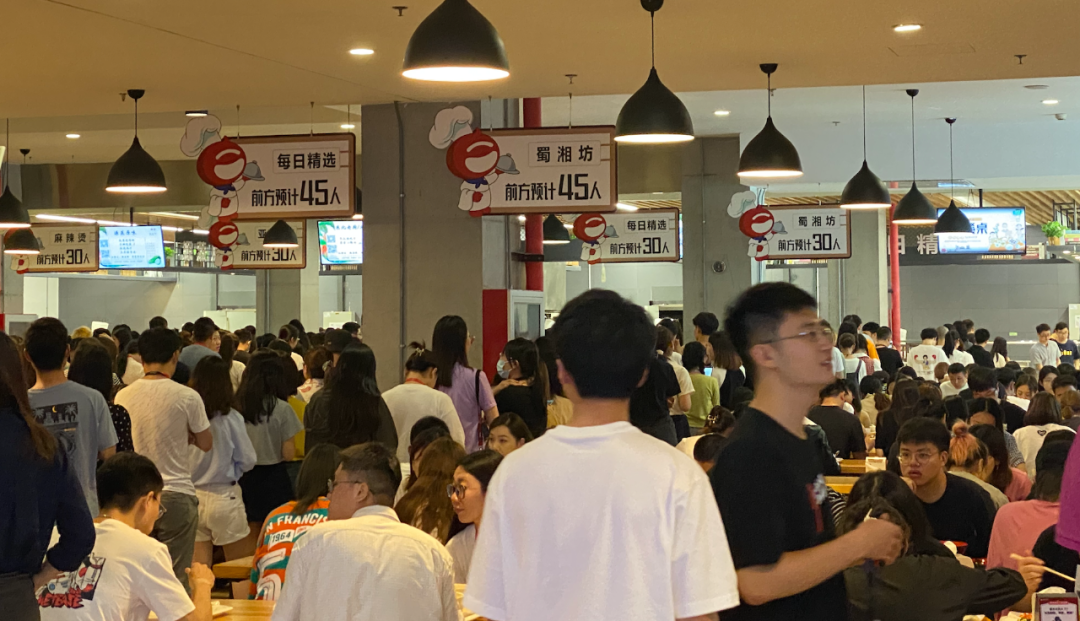 虽然打饭的队伍很长,但是大家都很有序,而且抬头有指示牌提示前方还有多少人排队,给人一种在迪士尼乐园排队玩过山车的错觉。