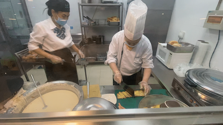 除了免费的午餐以外,食堂内还有可以花钱点餐的档口。 王哥吃完了免费的套餐以后,决定给自己加个煎饼吃一吃。