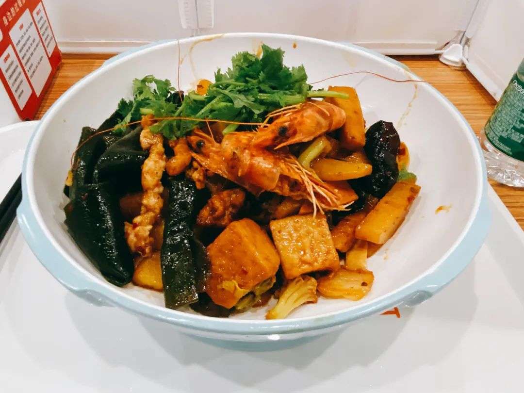 最后我点了一份麻辣香锅,看着碗中的大虾,和样品相比不能说毫不相干,只能说一模一样。