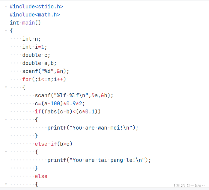 为每个人输出一行结论:如果是完美身材,输出You are wan mei!;如果太胖了,输出You are tai pang le!;否则输出You are tai shou le!。