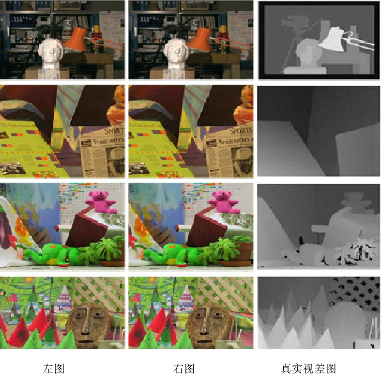 在 2002 年以前,虽然立体匹配算法得到很大的发展,但却没有一个统一的标准来评估算法的好坏。所以 Scharstein 和 Szelisk开发了在线评估平台Middlebury(vision.middlebury.edu/stereo) 网站,该平台提供了四组标准的立体匹配图像数据,分别为 Tsukuba、Venus、Teddy 和 Cones