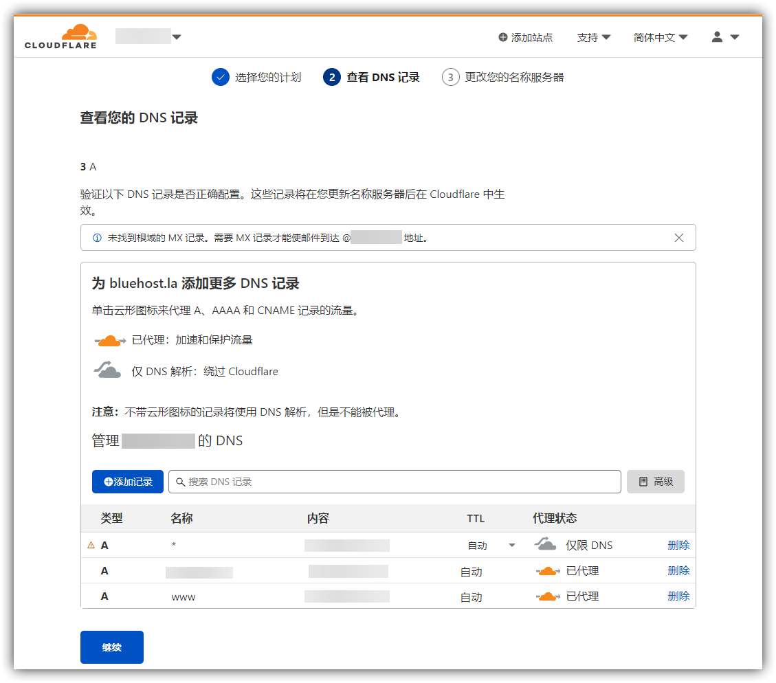 4.修改DNS记录,选择之后会自动扫描域名的DNS记录,其中On Cloudflare指通过CDN加速,Off Cloudflare指直连,可以通过Add Record按钮添加新的DNS记录。