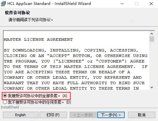 - 勾选“我接受许可协议中的全部条款”,然后继续安装;