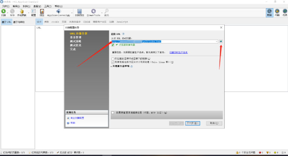 - 在下列输入框输入目标URL,连接成功如图下,还可以点击旁边的”地球小按钮“来验证你要扫描的网