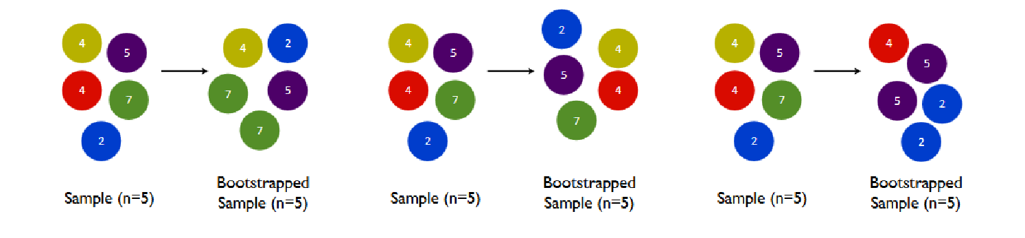 我们训练模型之前,必然会有一个巨大的数据集。我们都知道树模型是天生过拟合的模型,并且如果数据量太过巨大,树模型的计算会非常缓慢,因此,我们要对我们的原始数据集进行有放回抽样(bootstrap)。有放回的抽样每次只能抽取一个样本,若我们需要总共N个样本,就需要抽取N次。每次抽取一个样本的过程是独立的,这一次被抽到的样本会被放回数据集中,下一次还可能被抽到,因此抽出的数据集中,可能有一些重复的数据。