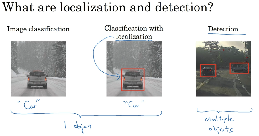 本周我们要研究的分类定位问题,通常只有一个较大的对象位于图片中间位置,我们要对它进行识别和定位。而在对象检测问题中,图片可以含有多个对象,甚至单张图片中会有多个不同分类的对象。因此,图片分类的思路可以帮助学习分类定位,而对象定位的思路又有助于学习对象检测,我们先从分类和定位开始讲起。