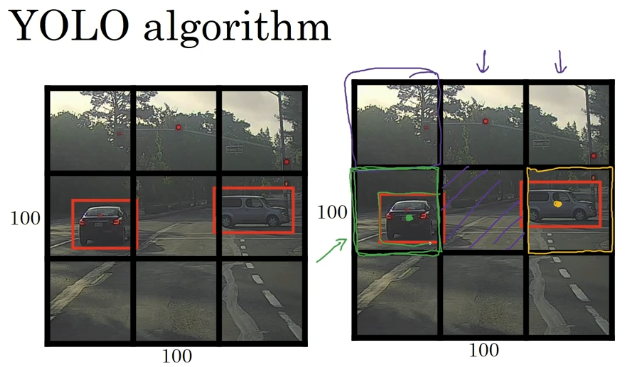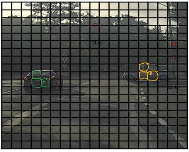 假设你需要在这张图片里检测行人和汽车,你可能会在上面放个 19×19 网格,理论上这辆车只有一个中点,所以它应该只被分配到一个格子里,左边的车子也只有一个中点,所以理论上应该只有一个格子做出有车的预测。