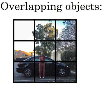 假设你有这样一张图片,对于这个例子,我们继续使用 3×3 网格,注意行人的中点和汽车的中点几乎在同一个地方,两者都落入到同一个格子中。你可以检测这三个类别,行人、汽车和摩托车,它将无法输出检测结果,所以我必须从两个检测结果中选一个。