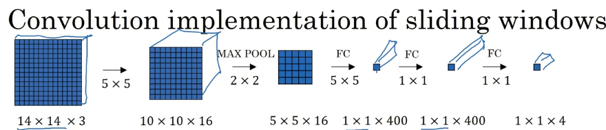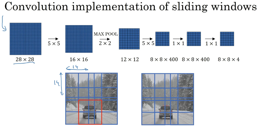 总结一下滑动窗口的实现过程,在图片上剪切出一块区域,假设它的大小是 14×14,把它输入到卷积网络。继续输入下一块区域,大小同样是 14×14,重复操作,直到某个区域识别到汽车。但是正如在前一页所看到的,我们不能依靠连续的卷积操作来识别图片中的汽车,比如,我们可以对大小为 28×28 的整张图片进行卷积操作,一次得到所有预测值,如果足够幸运,神经网络便可以识别出汽车的位置。