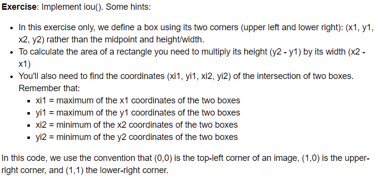 # GRADED FUNCTION: ioudef iou(box1, box2):"""Implement the intersection over union (IoU) between box1 and box2Arguments:box1 -- first box, list object with coordinates (x1, y1, x2, y2)box2 -- second box, list object with coordinates (x1, y1, x2, y2)"""# Calculate the (y1, x1, y2, x2) coordinates of the intersection of box1 and box2. Calculate its Area.### START CODE HERE ### (≈ 5 lines)xi1 = max(box1[0], box2[0])yi1 = max(box1[1], box2[1])xi2 = min(box1[2], box2[2])yi2 = min(box1[3], box2[3])inter_area = (xi2-xi1)*(yi2-yi1) ### END CODE HERE ### # Calculate the Union area by using Formula: Union(A,B) = A + B - Inter(A,B)### START CODE HERE ### (≈ 3 lines)box1_area = (box1[2]-box1[0]) * (box1[3]-box1[1])box2_area = (box2[2]-box2[0]) * (box2[3]-box2[1])union_area = box1_area + box2_area - inter_area### END CODE HERE #### compute the IoU### START CODE HERE ### (≈ 1 line)iou = inter_area/union_area### END CODE HERE ###return iou