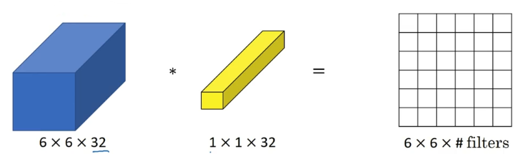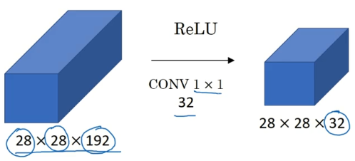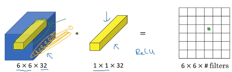 这个 1×1×32 过滤器中的 32 个数字可以这样理解,一个神经元的输入是 32 个数字(输入图片中左下角位置 32 个通道中的数字),即相同高度和宽度上某一切片上的 32 个数字,这 32 个数字具有不同通道,乘以 32 个权重(将过滤器中的 32 个数理解为权重),然后应用 ReLU 非线性函数,在这里输出相应的结果。