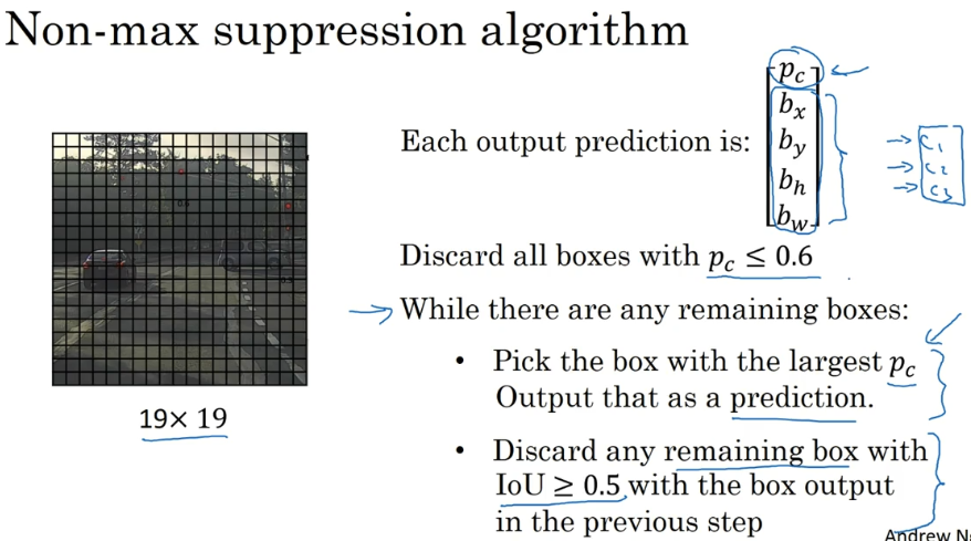 接下来剩下的边界框,没有抛弃没有处理过的,你就一直选择概率𝑝𝑐最高的边界框,然后把它输出成预测结果,这个过程就是上一张幻灯片,取一个边界框,让它高亮显示,这样你就可以确定输出做出有一辆车的预测。