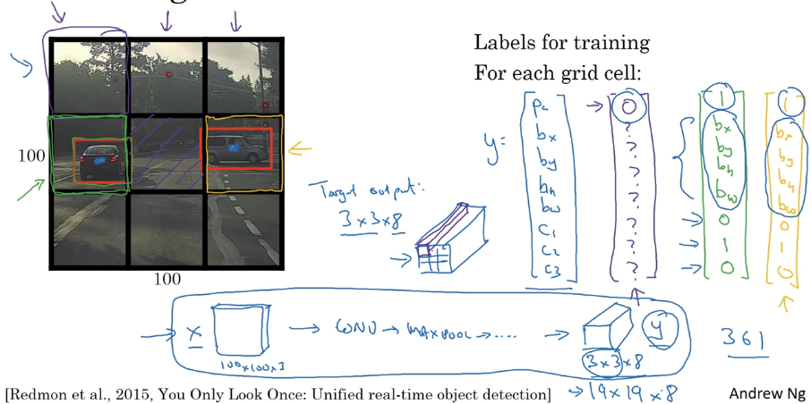 作为目标向量对应右边的格子。对于这个例子中,左上格子是 1×1×8,对应的是 9 个格子中左上格子的输出向量。所以对于这 3×3 中每一个位置而言,对于这 9 个格子,每个都对应一个 8 维输出目标向量𝑦,其中一些值可以是 dont care(即?),如果这里没有对象的话。所以总的目标输出,这个图片的输出标签尺寸就是 3×3×8。