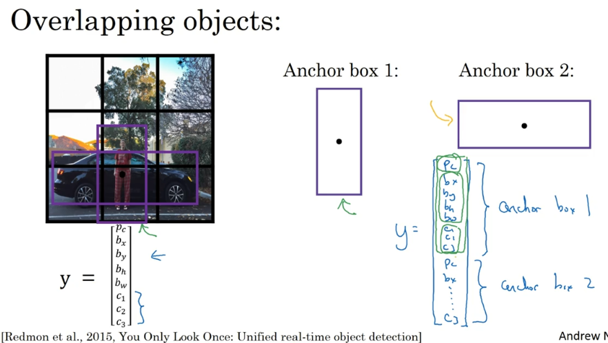 前面的𝑝𝑐, 𝑏𝑥, 𝑏𝑦, 𝑏ℎ, 𝑏𝑤, 𝑐1, 𝑐2, 𝑐3(绿色方框标记的参数)是和 anchor box 1 关联的 8 个参数,后面的 8 个参数(橙色方框标记的元素)是和 anchor box 2 相关联。因为行人的形状更类似于 anchor box 1 的形状,而不是 anchor box 2 的形状,所以你可以用这 8 个数值(前 8 个参数),这么编码𝑝𝑐 = 1,是的,代表有个行人,用𝑏𝑥, 𝑏𝑦, 𝑏ℎ和𝑏𝑤来编码包住行人的边界框,然后用𝑐1, 𝑐2, 𝑐3(𝑐1 = 1, 𝑐2 = 0, 𝑐3 = 0)来说明这个对象是个行人。