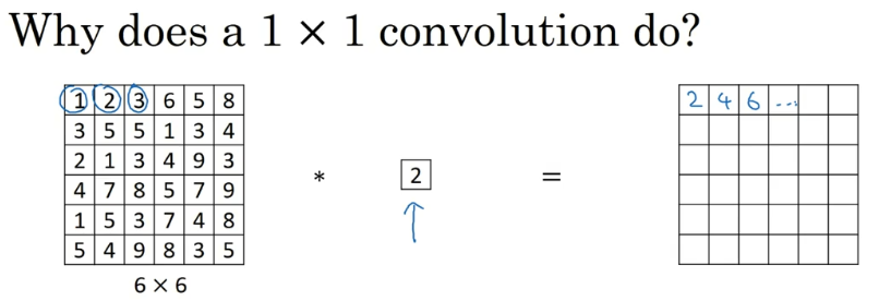 过滤器为 1×1,这里是数字 2,输入一张 6×6×1 的图片,然后对它做卷积,起过滤器大小为 1×1×1,结果相当于把这个图片乘以数字 2,所以前三个单元格分别是 2、4、6 等等。用 1×1 的过滤器进行卷积,似乎用处不大,只是对输入矩阵乘以某个数字。但这仅仅是对于 6×6×1 的一个通道图片来说,1×1 卷积效果不佳。