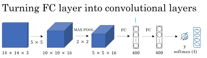 回到如何把神经网络的全连接层转化成卷积层。假设对象检测算法输入一个 14×14×3 的图像,图像很小,不过演示起来方便。在这里过 滤器大小为 5×5,数量是 16,14×14×3 的图像在过滤器处理之后映射为 10×10×16。然后通过参数为 2×2 的最大池化操作,图像减小到 5×5×16。然后添加一个连接 400 个单元的全连接层,接着再添加一个全连接层,最后通过 softmax 单元输出𝑦。为了跟下图区分开,我先做一点改动,用 4 个数字来表示𝑦,它们分别对应 softmax 单元所输出的 4 个分类出现的概率。 这 4 个分类可以是行人、汽车、摩托车和背景或其它对象。
