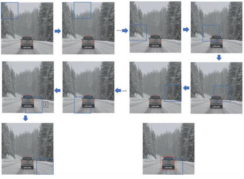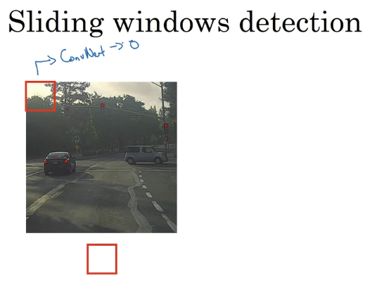 假设这是一张测试图片,首先选定一个特定大小的窗口,比如图片下方这个窗口,将这个红色小方块输入卷积神经网络,卷积网络开始进行预测,即判断红色方框内有没有汽车。滑动窗口目标检测算法接下来会继续处理第二个图像,即红色方框稍向右滑动之后的区域,并输入给卷积网络,因此输入给卷积网络的只有红色方框内的区域,再次运行卷积网络,然后处理第三个图像,依次重复操作,直到这个窗口滑过图像的每一个角落。