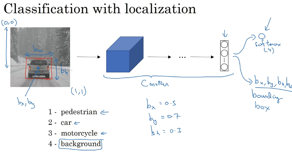 这就是标准的分类过程,如果你还想定位图片中汽车的位置,该怎么做呢?我们可以让神经网络多输出几个单元,输出一个边界框。具体说就是让神经网络再多输出 4 个数字,标记为𝑏𝑥,𝑏𝑦,𝑏ℎ和𝑏𝑤,这四个数字是被检测对象的边界框的参数化表示。(这里其实是YOLO算法的思想,将检测问题当作回归问题来做)
