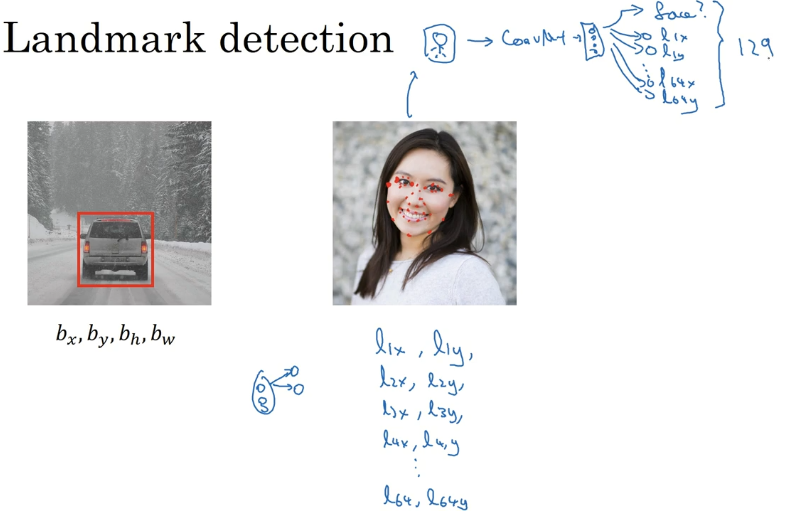 假设你正在构建一个人脸识别应用,出于某种原因,你希望算法可以给出眼角的具体位置。眼角坐标为(𝑥, 𝑦),你可以让神经网络的最后一层多输出两个数字𝑙𝑥和𝑙𝑦,作为眼角的坐标值。如果你想知道两只眼睛的四个眼角的具体位置,那么从左到右,依次用四个特征点来表示这四个眼角。对神经网络稍做些修改,输出第一个特征点(𝑙1𝑥,𝑙1𝑦),第二个特征点 (𝑙2𝑥,𝑙2𝑦),依此类推,这四个脸部特征点的位置就可以通过神经网络输出了。也许除了这四个特征点,你还想得到更多的特征点输出值,这些(图中眼眶上的红色特征点)都是眼睛的特征点,你还可以根据嘴部的关键点输出值来确定嘴的形状,从而判断人物是在微笑还是皱眉,也可以提取鼻子周围的关键特征点。为了便于说明,你可以设定特征点的个数,假设脸部有 64 个特征点,有些点甚至可以帮助你定义脸部轮廓或下颌轮廓。选 定特征点个数,并生成包含这些特征点的标签训练集,然后利用神经网络输出脸部关键特征点的位置。