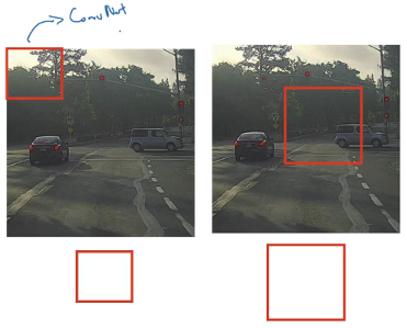重复上述操作,不过这次我们选择一个更大的窗口,截取更大的区域,并输入给卷积神 经网络处理,你可以根据卷积网络对输入大小调整这个区域,然后输入给卷积网络,输出 0 或 1。再以某个固定步幅滑动窗口,重复以上操作,遍历整个图像,输出结果。不论汽车在图片的什么位置,总有一个窗口可以检测到它。