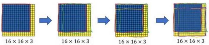 假设输入给卷积网络的图片大小是 14×14×3,测试集图片是 16×16×3,现在给这个输入 图片加上黄色条块,在最初的滑动窗口算法中,你会把这片蓝色区域输入卷积网络(红色笔标记)生成 0 或 1 分类。接着滑动窗口,步幅为 2 个像素,向右滑动 2 个像素,将这个绿框区域输入给卷积网络,运行整个卷积网络,得到另外一个标签 0 或 1。继续将这个橘色区域输入给卷积网络,卷积后得到另一个标签,最后对右下方的紫色区域进行最后一次卷积操作。我们在这个 16×16×3 的小图像上滑动窗口,卷积网络运行了 4 次,于是输出了了 4 个标签。