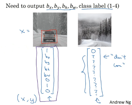 这种情况下,𝑝𝑐 = 0,𝑦的其它参数将变得毫无意义,这里我全部写成问号,表示“毫无意义”的参数,因为图片中不存在检测对象,所以不用考虑网络输出中边界框的大小,也不用考虑图片中的对象是属于𝑐1、𝑐2和𝑐3中的哪一类。针对给定的被标记的训练样本,不论图片中是否含有定位对象,构建输入图片𝑥和分类标签𝑦的具体过程都是如此。这些数据最终定义了训练集。