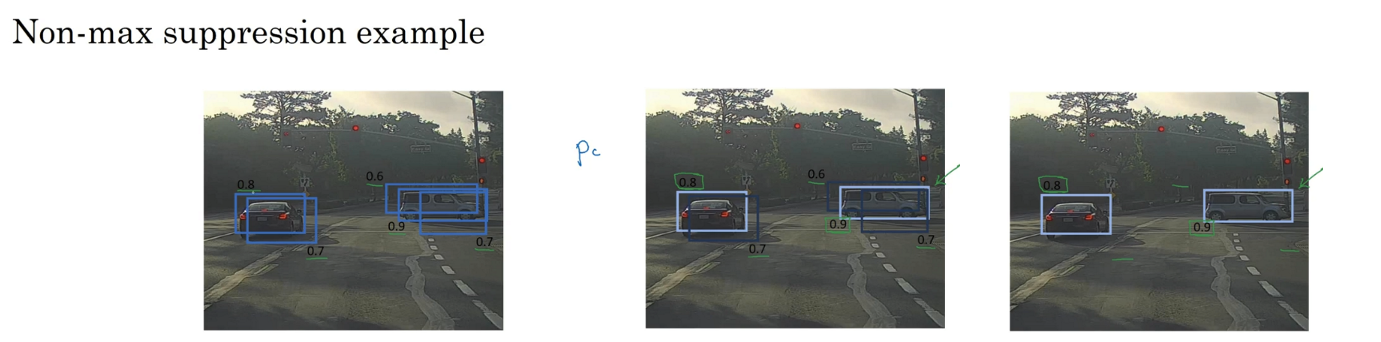 所以具体上,这个算法做的是,首先看看每次报告每个检测结果相关的概率𝑝𝑐,在本周的编程练习中有更多细节,实际上是𝑝𝑐乘以𝑐1、𝑐2或𝑐3。现在我们就说,这个𝑝𝑐检测概率,首先看概率最大的那个,这个例子(右边车辆)中是 0.9,然后就说这是最可靠的检测,所以我们就用高亮标记,就说我这里找到了一辆车。这么做之后,非极大值抑制就会逐一审视剩下的矩形,所有和这个最大的边框有很高交并比,高度重叠的其他边界框,那么这些输出就会被抑制。所以这两个矩形𝑝𝑐分别是 0.6 和 0.7,这两个矩形和淡蓝色矩形重叠程度很高,所以会被抑制,变暗,表示它们被抑制了。