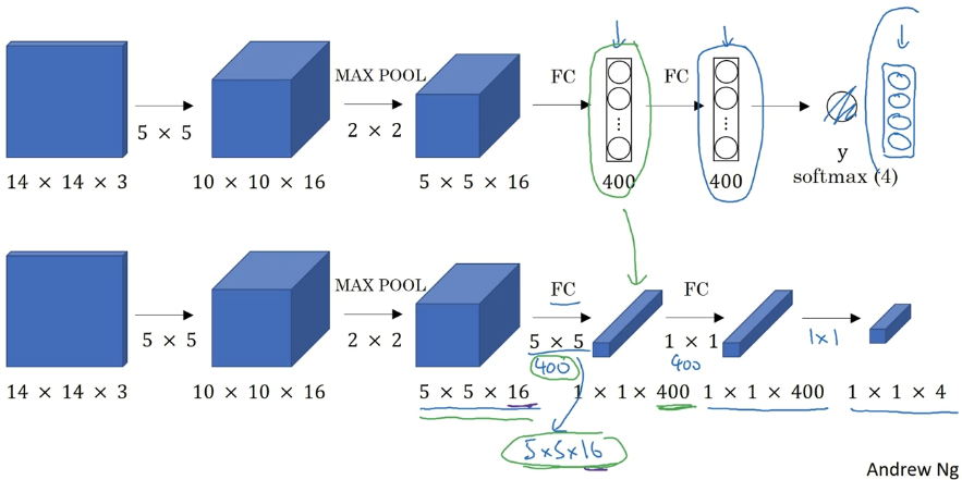 接下来就是如何把这些全连接层转化为卷积层,画一个这样的卷积网络,它的前几层和之前的一样,而对于下一层,也就是这个全连接层,我们可以用 5×5 的过滤器来实现,数量是 400 个(编号 1 所示),输入图像大小为 5×5×16,用 5×5 的过滤器对它进行卷积操作,过滤器实际上是 5×5×16,因为在卷积过程中,过滤器会遍历这 16 个通道,所以这两处的通道数量必须保持一致,输出结果为 1×1。假设应用 400 个这样的 5×5×16 过滤器,输出维度就是 1×1×400,我们不再把它看作一个含有 400 个节点的集合,而是一个 1×1×400 的输出层。从数学角度看,它和全连接层是一样的,因为这 400 个节点中每个节点都有一个 5×5×16 维度的过滤器,所以每个值都是上一层这些 5×5×16 激活值经过某个任意线性函数的输出结果。