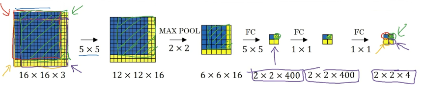 结果发现,这 4 次卷积操作中很多计算都是重复的。所以执行滑动窗口的卷积时使得卷积网络在这 4 次前向传播过程中共享很多计算。卷积网络运行同样的参数,使得相同的 5×5×16 过滤器进行卷积操作,得到 12×12×16 的输出层。然后执行同样的最大池化,输出结果 6×6×16。照旧应用 400 个 5×5 的过滤器,得到一个 2×2×400 的输出层,现在输出层为 2×2×400,而不是 1×1×400。应用 1×1 过滤器得到另一个 2×2×400 的输出层。再做一次全连接的操作,最终得到 2×2×4 的输出层,而不是 1×1×4。最终,在输出层这 4 个子方块中,蓝色的是图像左上部分 14×14 的输出(红色箭头标识),右上角方块是图像右上部分(绿色箭头标识)的对应输出,左下角方块是输入层左下角(橘色箭头标识),也就是这个 14×14 区域经过卷积网络处理后 的结果,同样,右下角这个方块是卷积网络处理输入层右下角 14×14 区域(紫色箭头标识)的结果。