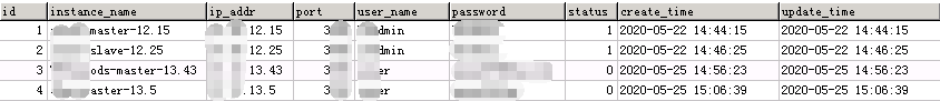 CREATE TABLE `db_instance` (`id` int(11) NOT NULL AUTO_INCREMENT,`instance_name` varchar(50) COLLATE utf8mb4_bin NOT NULL,`ip_addr` varchar(15) COLLATE utf8mb4_bin NOT NULL,`port` int(11) NOT NULL,`user_name` varchar(50) COLLATE utf8mb4_bin NOT NULL,`password` varchar(50) COLLATE utf8mb4_bin NOT NULL,`status` int(1) NOT NULL DEFAULT '0' COMMENT '0:active, 1:inactive',`create_time` datetime NOT NULL DEFAULT CURRENT_TIMESTAMP,`update_time` datetime NOT NULL DEFAULT CURRENT_TIMESTAMP,PRIMARY KEY (`id`),UNIQUE KEY `idxu_instancename` (`instance_name`),UNIQUE KEY `idx_ip_port` (`ip_addr`,`port`)