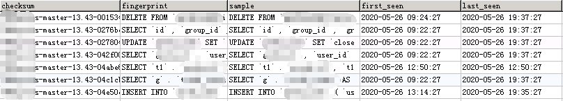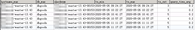 'table_fields' => array('date', 'cnt','max_freq','first_seen','last_seen','query_time_avg')$conf['report_defaults'] = array('fact-order' => 'cnt DESC','table_fields' => array('checksum','hostname','db','sql_short','cnt','max_freq','first_seen','last_seen','query_time_avg'),'dimension-hostname_max' => '一个默认的实例名称' ## 指定实例默认值,否则默认查所有数据,响应慢'custom_fields' => array('checksum' => 'checksum','hostname' => 'hostname_max','db' => 'db_max','sql_short' => 'LEFT(fact.sample,30)','cnt' => 'sum(ts_cnt)','max_freq' => 'max(ts_cnt)','query_time_avg' => 'ROUND(avg(query_time_avg),1)','first_seen' => 'substring(min(ts_min),1,16)','last_seen' => 'substring(max(ts_max),1,16)','date' => 'substring(ts_min,1,10)','minute_ts' => 'round(unix_timestamp(substring(ts_min,1,16)))'),