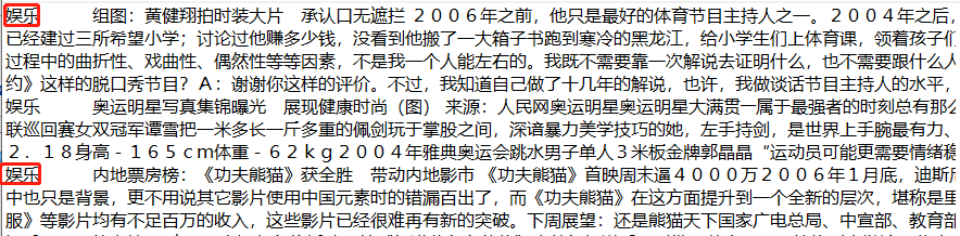 需要有新闻数据和停用词文档做前期的数据准备工作,使用jieba分词和pandas对初始数据进行预处理工作,数据总量为12000。初始数据集如下图: