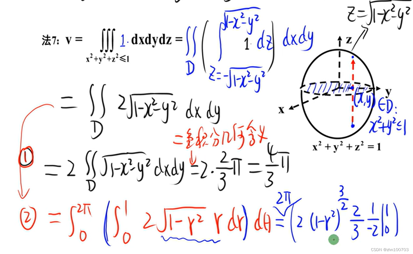 ,根据几何含义可以知道这个积分表示的是上半球的体积(当然这里球的体积应该算是未知的,这里只是想要熟悉一下二重积分的几何定义)