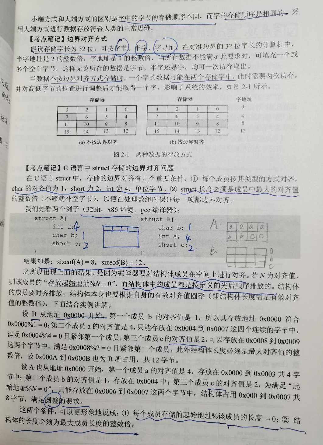 边界对齐方式:不按照边界对齐方式存储,一个字的数据可能在两个存储字中,此时需要两次访存。其中,char的对齐值为1,short为2,int为4字节。