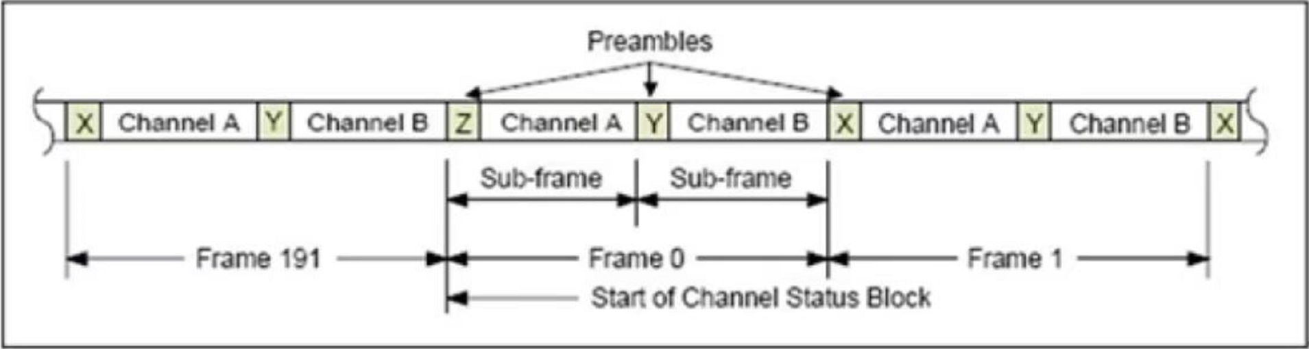 如下图IEC60958由192个Frame构成的Block,而每个Frame储存了两个channel的一组采样信号(Sample),分为Channel A与Channel B两个声道。而每组Sample由Sub Frame构成,也就是一个Frame里有两个Sub Frame。Sub Frame的数据长度为32 Bits,里头内含了头码(Preamble)、辅助数据(Aux. Data)、音频数据(Audio Data)、以及四个位的信息与检查码。也就是说,一个Sub Frame为32 Bits,也就4 Bytes,而一个Frame为8 Bytes,而一个Block为192 x 8 = 1536 Bytes,而每个Block总共可以传递192个双声道Sample。