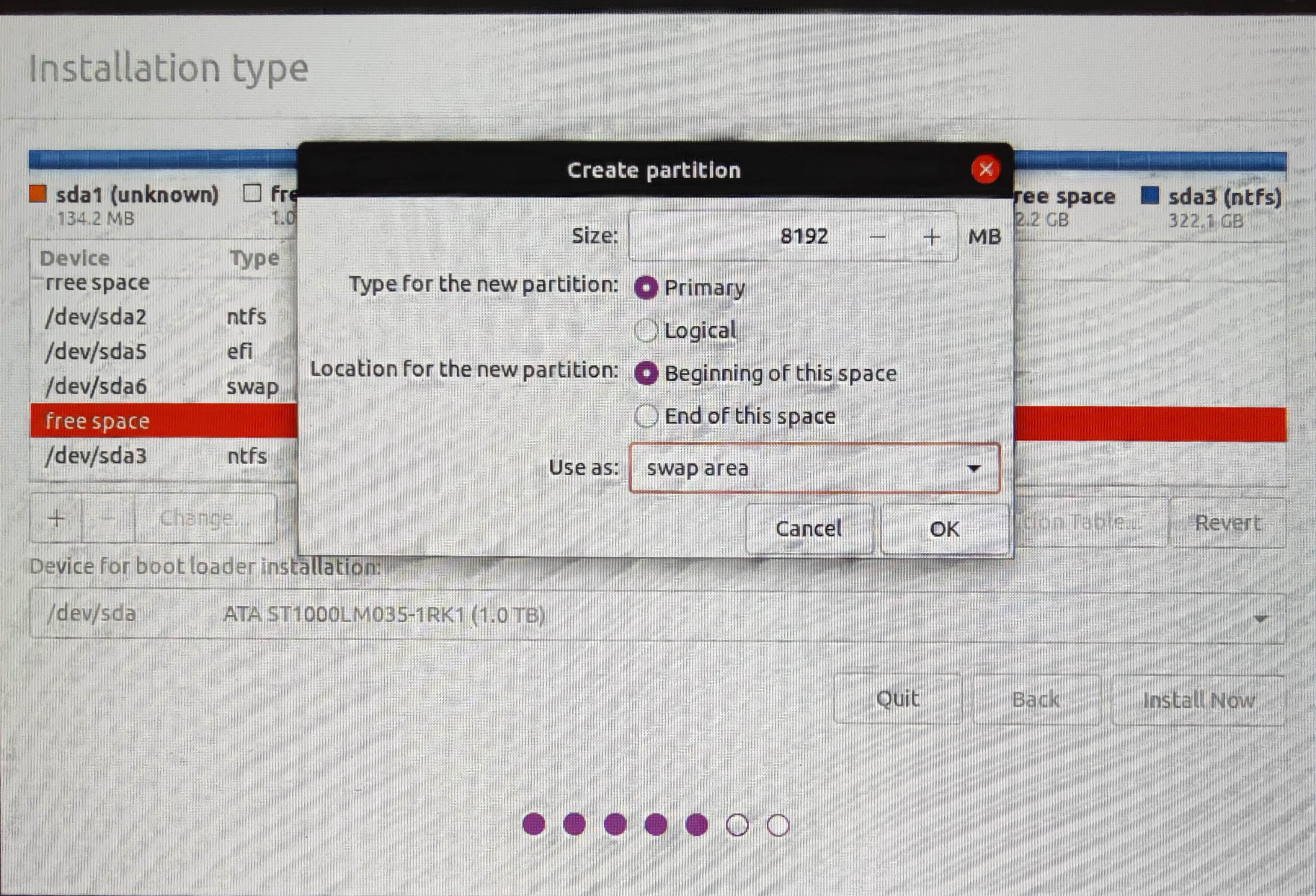 注:在进行下一步之前要选择boot loader的安装位置,该位置必须设置为efi分区。