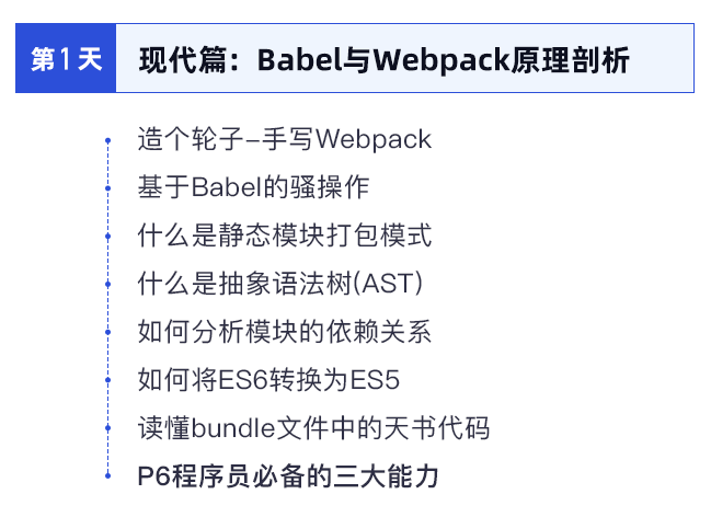 第一天,然叔将带你手写 Webpack ,学习 Bable 、AST 等技术点,并讲解P6程序员必备的三大能力。
