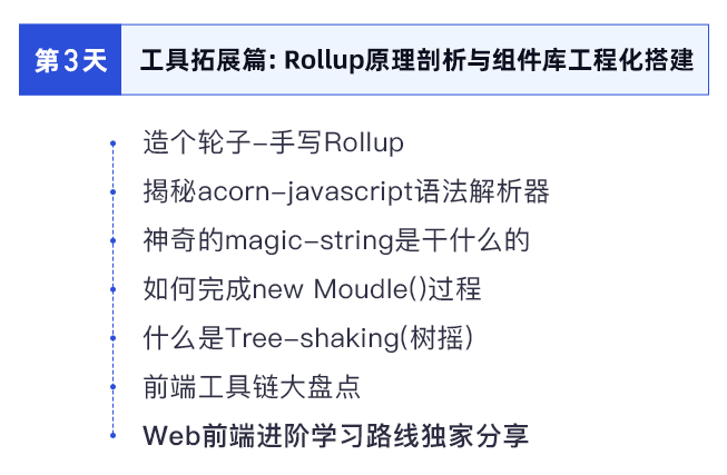 第三天,手写 Rollup,并带领大家进行前端工具链大盘点,还有然叔总结的前端学习路线分享。不知道该如何进阶的朋友们快来!