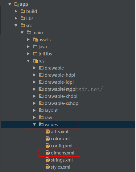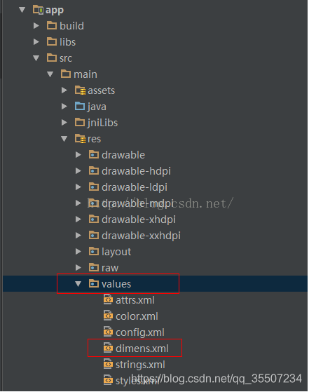dimen是用来定义尺寸的资源文件,默认路径:工程的res\values\dimens.xml,如下图所示:
