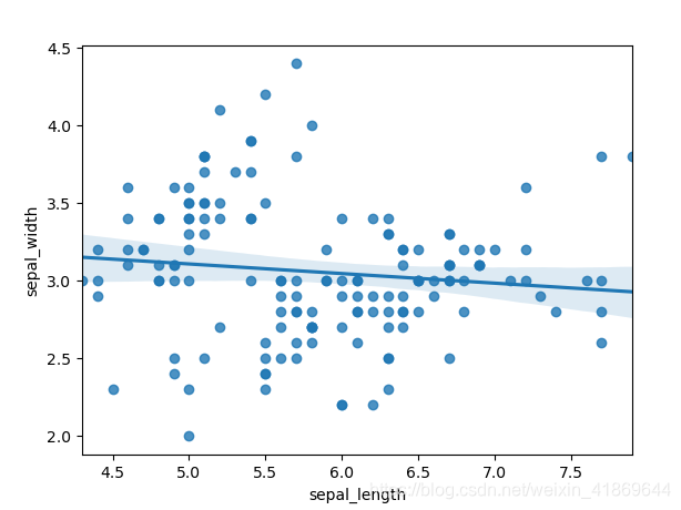 df = sns.load_dataset('iris')p1=sns.regplot(x=df["sepal_length"], y=df["sepal_width"])