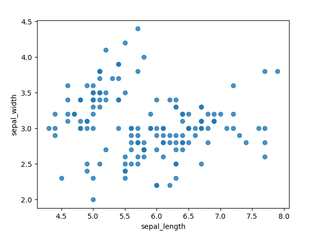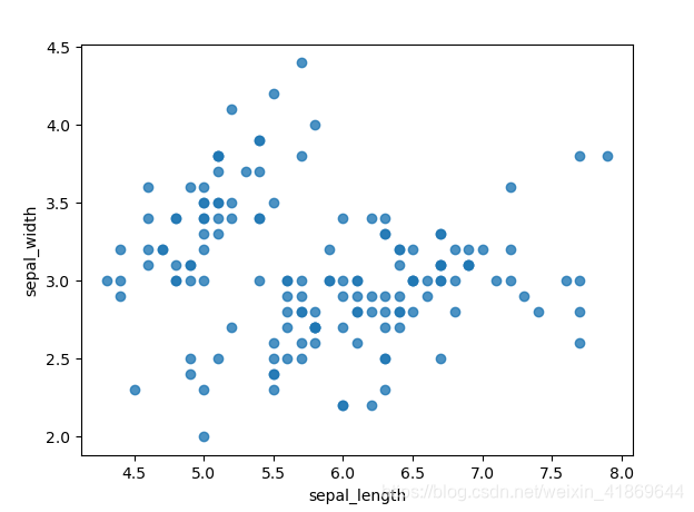 df = sns.load_dataset('iris')p2=sns.regplot(x=df["sepal_length"], y=df["sepal_width"], fit_reg=False)