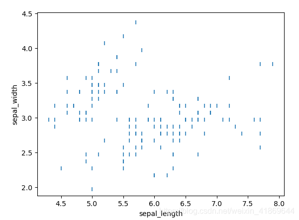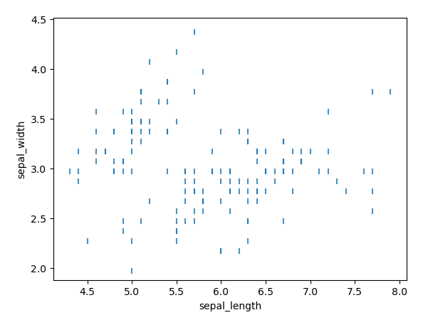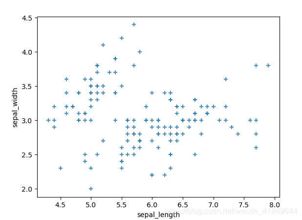 df = sns.load_dataset('iris')p1=sns.regplot(x=df["sepal_length"], y=df["sepal_width"], marker="+", fit_reg=False)