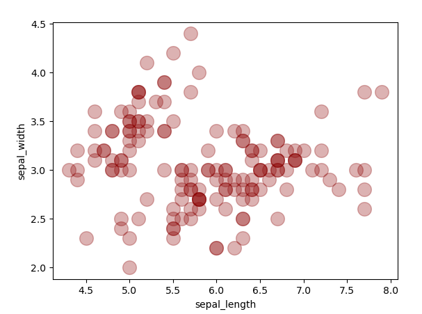 df = sns.load_dataset('iris')p2=sns.regplot(x=df["sepal_length"], y=df["sepal_width"], fit_reg=False, scatter_kws={"color":"darkred","alpha":0.3,"s":200} )