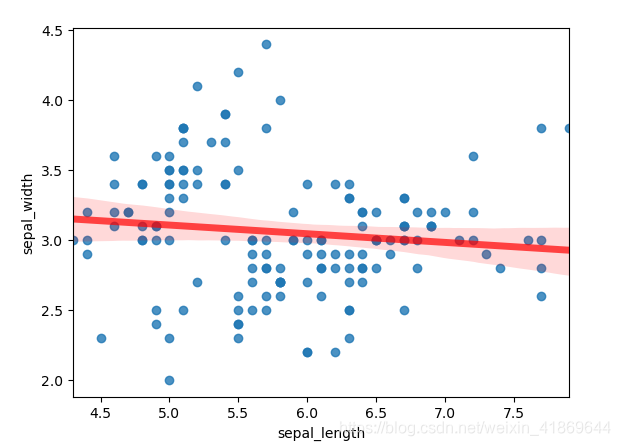 df = sns.load_dataset('iris')p1=sns.regplot(x=df["sepal_length"], y=df["sepal_width"], line_kws={"color":"r","alpha":0.7,"lw":5})